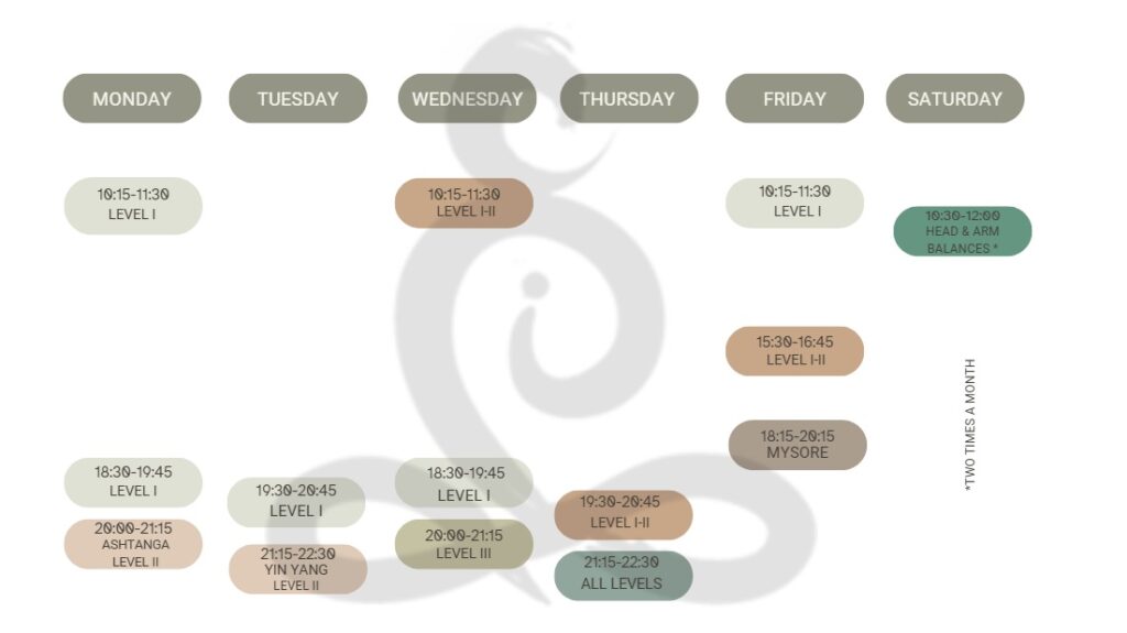 The duration of the courses is 75 minutes, time that is considered enough to enjoy your practice safely, and time that can be allocated by most of us. An exception is the Mysore practice, the duration of which varies from person to person.