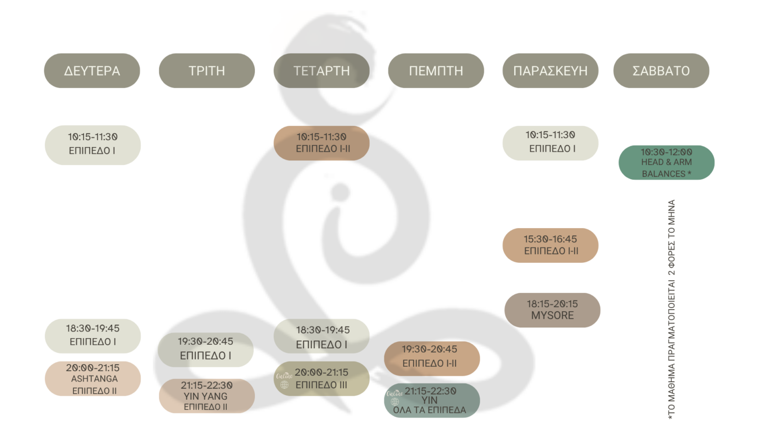 Η διάρκεια των μαθημάτων είναι 75 λεπτά, χρόνος που θεωρείται αρκετός για να απολαύσετε την πρακτική σας με ασφάλεια, και χρόνος που μπορεί να διατεθεί από τους περισσότερους από εμάς. Εξαίρεση αποτελoουν η πρακτική Mysore, handstands και feel good.